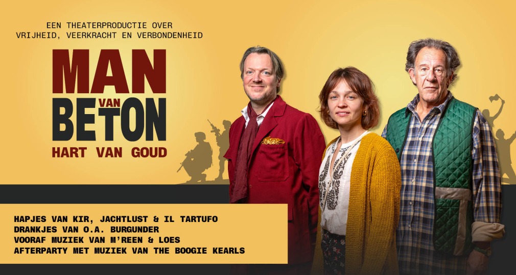 Op vrijdagavond 6 juni is er een exclusieve avond rondom de theaterproductie ‘Man van Beton – Hart van Goud’. Steun de theaterproductie en geniet tijdens deze avond van de voorstelling, én van een compleet programma met hapjes van Kir, Jachtlust en Il Tartufo en live-muziek!