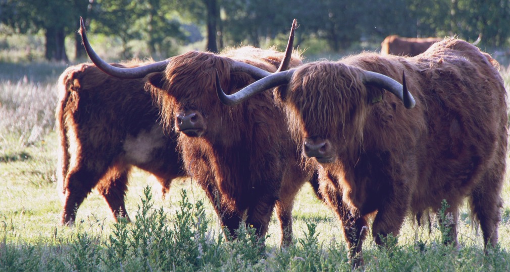 2Schotse hooglanders bekijken in Het Witte Veen. Borrelen en spel